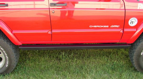 Rock hard 4x4 Cherokee XJ rocker Guards are made from 2" x 3" x .120 Wall Tubing. Ends are Tapered and enclosed. They have 3 brackets that have 3 bolts each mounting them through the pinch rail and 3 braces mounting them to the frame rail. All mounting hardware is included. Comes Black Powder Coated. Fits 2 & 4 door models.
